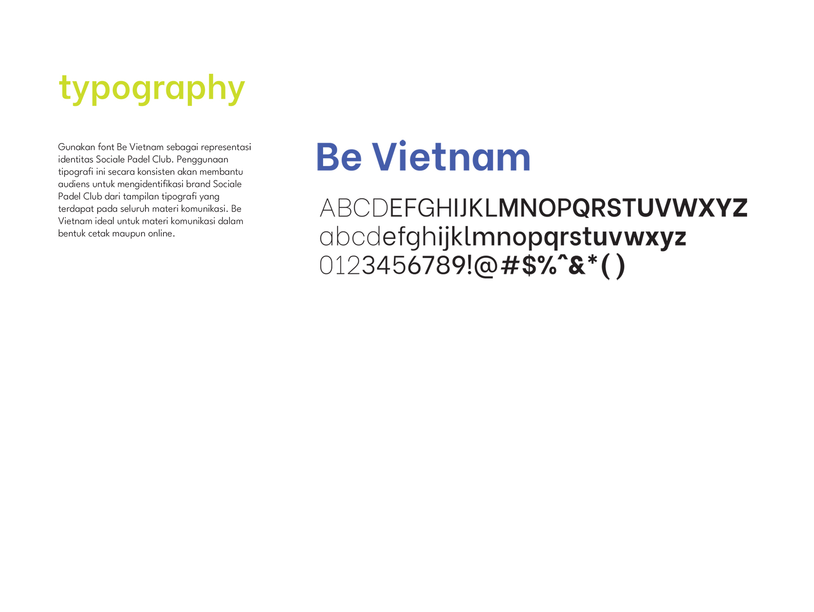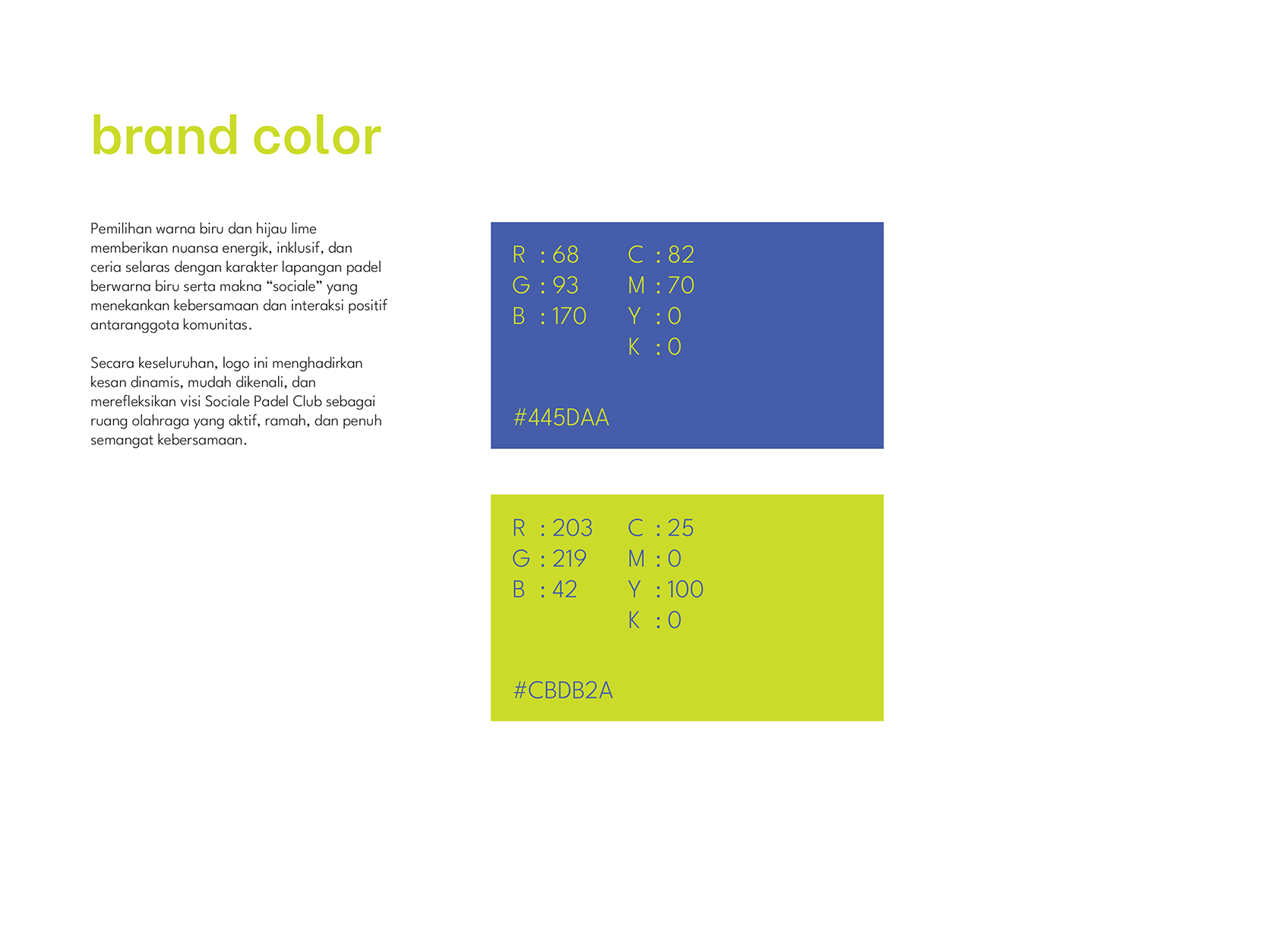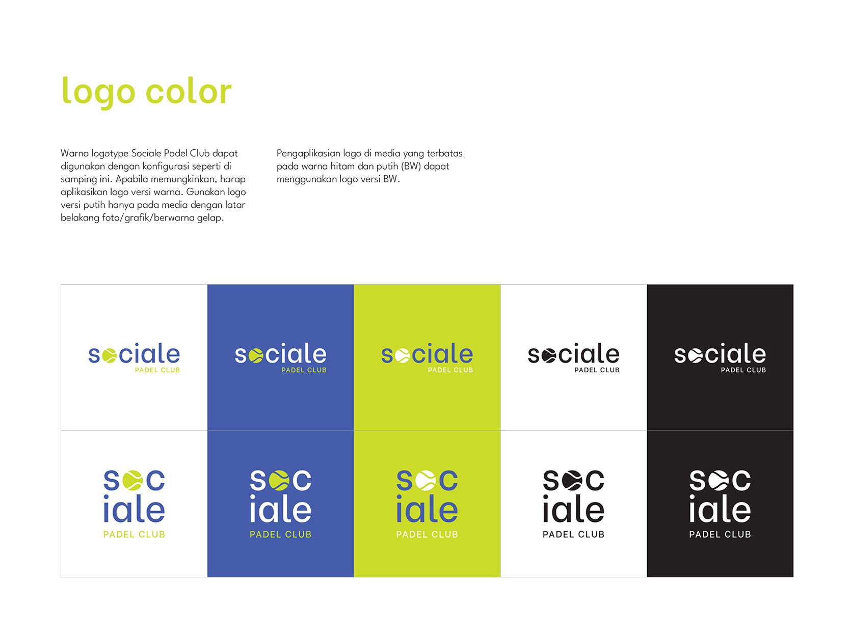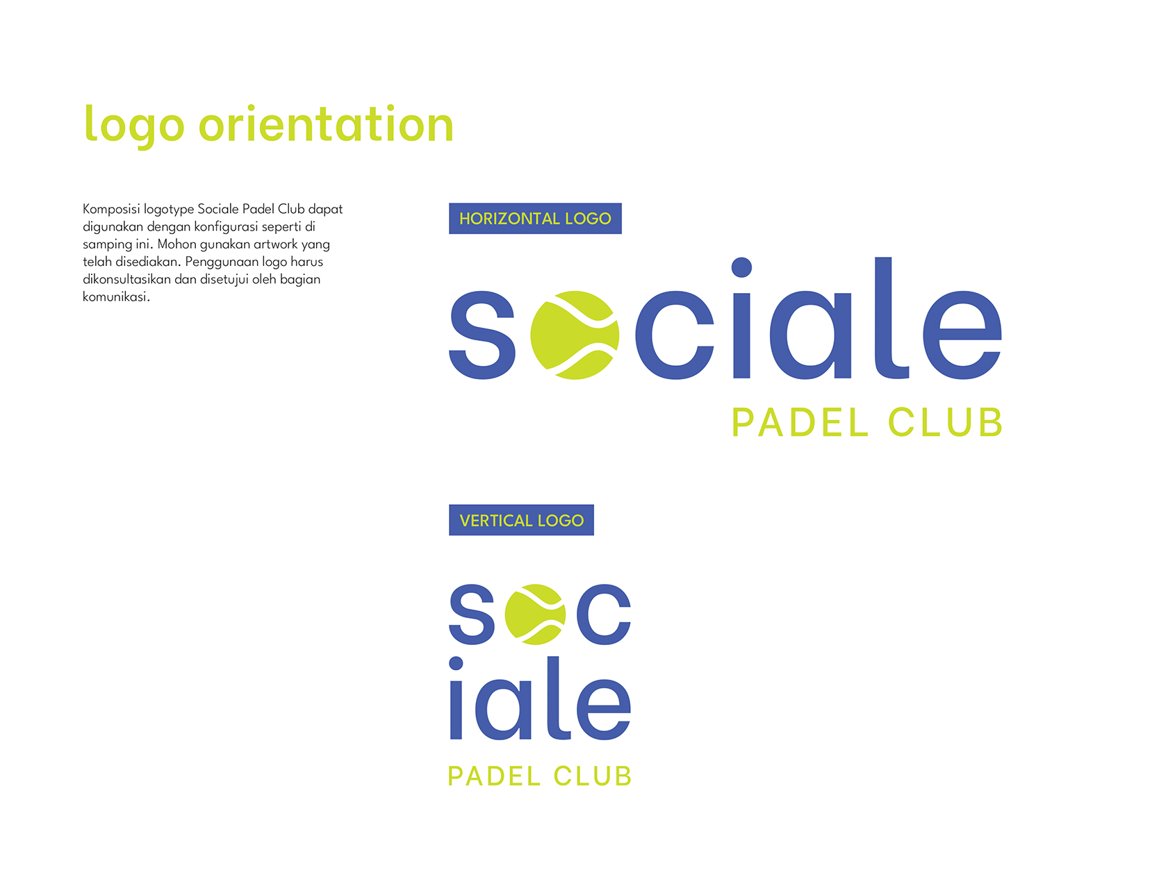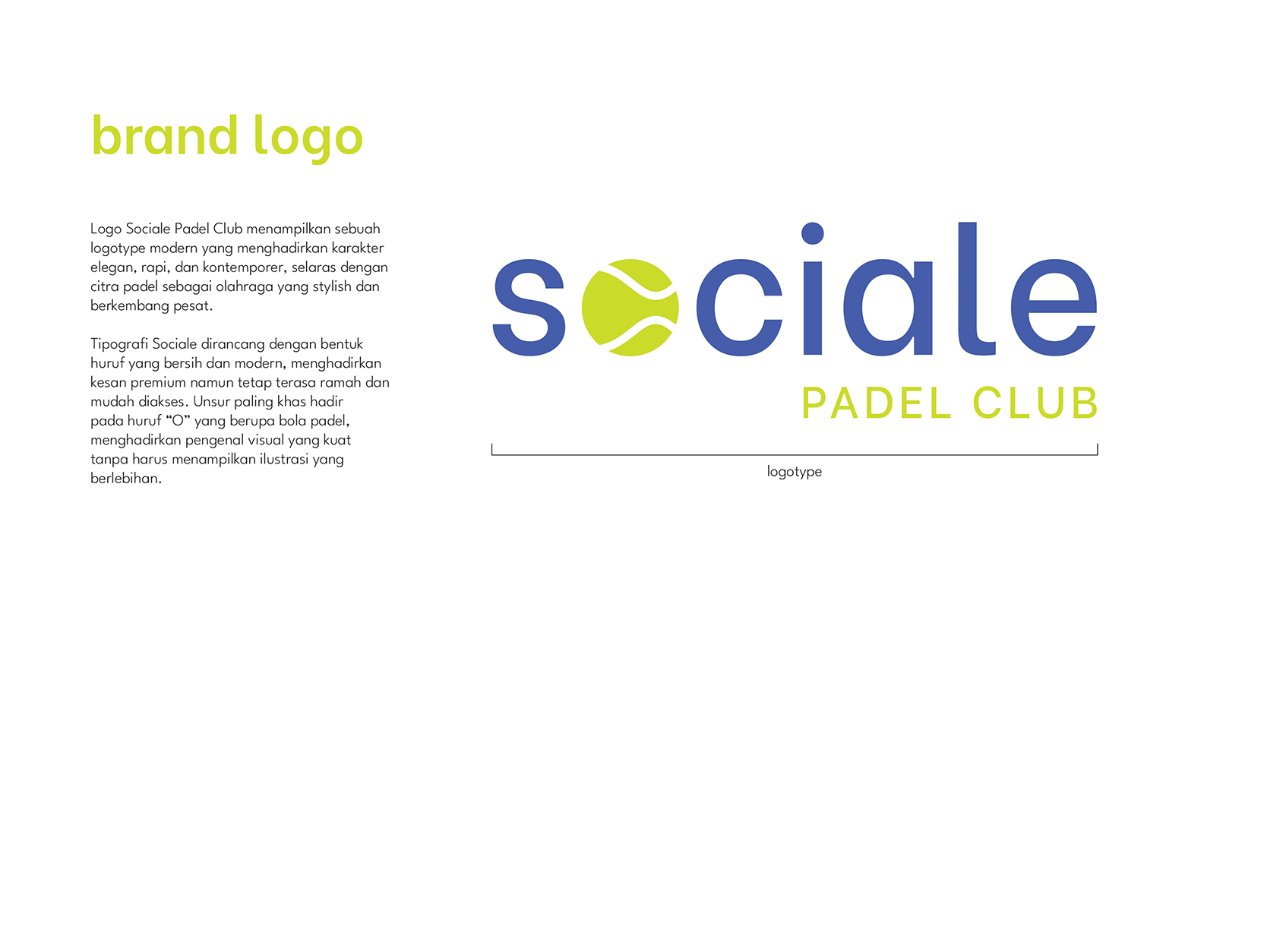 Tipografi Sociale dirancang dengan bentuk huruf yang bersih, modern, dan proporsional, mencerminkan kualitas premium namun tetap terasa ramah dan mudah diakses. Elemen paling khas hadir pada huruf “O” yang dimodifikasi menjadi bola padel, menciptakan identitas visual yang kuat dan mudah diingat tanpa perlu ilustrasi berlebihan. Pendekatan ini menjadi ciri khas Artmosphere dalam menghadirkan solusi branding padel club yang strategis, relevan, dan berkelanjutan.